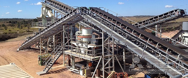 首先,石料由給料機均勻地送進粗碎機進行初步破碎,然后,產成的粗料由膠帶輸送機輸送至反擊式破碎機進行進一步破碎,細碎后的石料進振動篩篩分出不同規格的石子,不滿足粒度要求的石子返料進反擊式破碎機再次破碎。大塊石料經料倉由振動給料機均勻地送進顎式破碎機進行粗碎,粗碎后的石料由膠帶輸送機送到反擊式破碎機進行進一步破碎。細碎后的石料由膠帶輸送機送進振動篩進行篩分,篩分出幾種不同規格的石子,滿足粒度要求的石子由成品膠帶輸送機送往成品料堆。不滿足粒度要求的石子由膠帶輸送機返料送到反擊式破碎機進行再次破碎,形成閉路多次循環。成品粒度可按照用戶的需求進行組合和分級,為保護環境,可配備輔助的除塵設備。