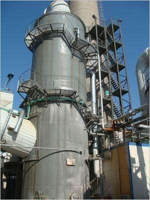 1.2.2吸收塔系統(tǒng):煙氣從吸收塔中下側(cè)進(jìn)入與上側(cè)噴淋的石灰石漿液逆流接觸,在塔內(nèi)進(jìn)行化學(xué)反應(yīng),對(duì)落入吸收塔漿池的反應(yīng)物再進(jìn)行氧化反應(yīng),得到脫硫副產(chǎn)品二水石膏。經(jīng)吸收劑洗滌脫硫后的清潔煙氣,通過(guò)除霧器除去霧滴后由吸收塔上側(cè)引出,排入煙囪。